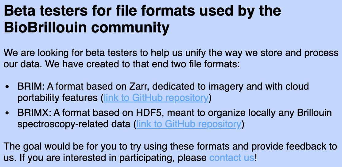 Hi Pierre, thanks for preparing the documents and sorry for the late reply, but we were finalizing the website in the past days. For the newsletter, I discussed with Robert and Sebastian and we would propose the attached paragraph. I attached also a PDF including my additions to the tutorial and I pushed the changes on the HDF5_BLS GitHub as well. To follow up on Robert's previous email, shall we have a meeting on Thursday 11th at 3pm? Best, Carlo On Thu, Sep 4, 2025 at 10:16, Pierre Bouvet wrote: Hi everyone, I’ll send the newsletter tomorrow, just want to make sure the message is OK. From what I understood, Carlo wanted to advertise more but Robert you preferred the first version? I’ve joined the capture of the paragraph dedicated to the file format. Also have you had time to work on the tutorial I’ve done? The email sends back to the software mail so we’ll all receive a notification if someone is interested, but I think we should stick to sending 1 PDF to test both formats and treatment. Best, Pierre Pierre Bouvet, PhD Post-doctoral Fellow Medical University Vienna Department of Anatomy and Cell Biology Wahringer Straße 13, 1090 Wien, Austria