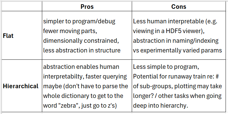 Hi guys, Continuing from my previous email, here's a quick example script comparing the two / converting between with dummy data. Obviously this has group names/number of sub-groups hardcoded in, but this can be done dynamically fairly easily I think. Hope you have a nice weekend, Sal --------------------------------------------------------------- Salvatore La Cavera III Royal Academy of Engineering Research Fellow Nottingham Research Fellow Optics and Photonics Group University of Nottingham Email: salvatore.lacaveraiii@nottingham.ac.uk<mailto:salvatore.lacaveraiii@nottingham.ac.uk> ORCID iD: 0000-0003-0210-3102 [cid:319991a5-dfd3-4c8b-a77d-bfbfa17ef26c]<https://outlook.office.com/bookwithme/user/6a3f960a8e89429cb6fc693c01d10119@...> Book a Coffee and Research chat with me! ________________________________ From: Sal La Cavera Iii via Software <software@biobrillouin.org> Sent: 06 March 2025 16:06 To: software@biobrillouin.org <software@biobrillouin.org>; Carlo Bevilacqua <carlo.bevilacqua@embl.de> Subject: [Software] Re: [EXTERN] Re: Software manuscript / BLS microscopy Hi everyone, First off I just want to acknowledge the hard work and thoughtful approaches coming from both sides! I think this is one of those situations where there's no clearcut perfect/ideal way to do it. Yes perhaps certain approaches will be most compatible with certain visions / anticipated use-cases. Right now I see this as not " a battle for supremacy of the future BLS signal processing pipeline" but more of an opportunity to "integrate over different opinions which by definition will result in the most generalised useful solution for the future community." With that being said, I think we're getting a bit stuck in the mud / failure to launch / paralysis by over-analysis (insert whatever idiom you'd like here). I appreciate that we want to get this right from the very beginning so that we're united with a clear vision/future direction, and to avoid backtracking/redoing things as much as possible. I also appreciate that I do not have a horse in this race compared to you guys. Our lab uses custom matlab code, and we only consider ourselves in how it was developed. You guys on the other hand, use similar equipment / data sets / signal processing pipelines. But we're at the point where each lab wants "their way" of doing things to be adopted by the world (and leads to impasses and entrenchment). I digress... I haven't worked with hdf5 before, so my expertise is somewhat limited, but from what I can gather based on reading up on things / the points made in your debates there are some pro's/con's for each approach: [cid:d82e47c3-43aa-4c30-a369-f87a1af762fd] (I may be wrong on some of the above, feel free to ignore/correct etc) If we're expecting absolutely MASSIVE experiments to be pumped through the system, then perhaps the abstraction offered by the hierarchical approach is preferred and the additional complexity is justified. If we're instead appealing to the average user that just wants to store a couple imaging results and visualise, then staying lean-and-mean with the flat approach seems easiest. Historically our lab tends towards the flatter side of things, but this is potentially because we haven't done enormous enormous multivariate studies yet. And so in terms of future use cases for this project wrt our time domain lab, the multivariate experimental data organisation is most useful for us compared to just visualising the data (we already do that routinely with interactive plots/maps). Perhaps the flat-to-hierarchical (and vice-versa) conversion functionality is the way to go? Yes it will be more work, but it will give the Nat Meth/BLS community a better/tuneable product. So the user can choose which structure type they want in their h5 file. But I think we definitely want the plotting functionality to be dependent on a single structure (e.g. flat). So the conversion function will play a functional role in ensuring compatibility with the plotting (also hdf5 files potentially not generated by our project). Otherwise, if we want the debate to continue, perhaps both sides should prepare a mock h5 file with the different structures? E.g. 8 data sets with 2 Specimens with 2 temperatures each and 2 mutations each? (even if it's just the same data copied over a bunch of times). Then we can send the file around, have a play, compare scripts, etc. Happy to support no matter which path is chosen, and will have availability to meet biweekly as discussed! Cheers everyone, Sal --------------------------------------------------------------- Salvatore La Cavera III Royal Academy of Engineering Research Fellow Nottingham Research Fellow Optics and Photonics Group University of Nottingham Email: salvatore.lacaveraiii@nottingham.ac.uk<mailto:salvatore.lacaveraiii@nottingham.ac.uk> ORCID iD: 0000-0003-0210-3102 [cid:ade5ba43-1fd8-4857-8e32-c3c2a25897bc]<https://outlook.office.com/bookwithme/user/6a3f960a8e89429cb6fc693c01d10119@...> Book a Coffee and Research chat with me! ________________________________ From: Carlo Bevilacqua via Software <software@biobrillouin.org> Sent: 05 March 2025 15:58 To: software@biobrillouin.org <software@biobrillouin.org> Subject: [Software] Re: [EXTERN] Re: Software manuscript / BLS microscopy Hi Kareem, thanks for great summary. I largely agree with the way you described what I have in mind, I would only add two points: * In the case of discrete parameters they can be stored as "fake" timepoints, as you mentioned. I think this is fair, because anyways they will be in practice acquired at different times (one need to change the sample, temperature, etc...). In that case the only difference between my and Pierre's approach is that Pierre would store them in a hierarchical structure and I would do it in a flatten structure (which I believe is always possible because the hierarchy in Pierre's case is not given by some parent/children relationship, but each leaf of the tree is uniquely defined by a set 